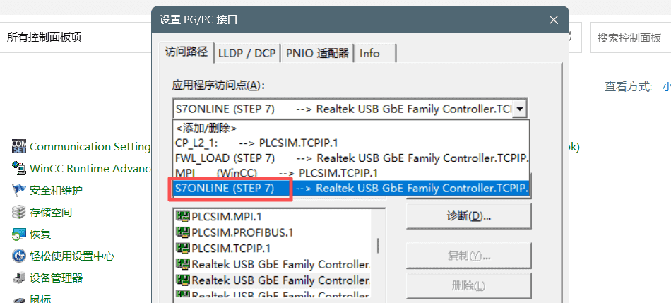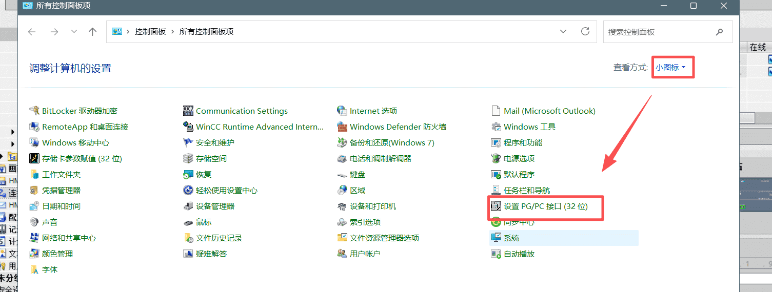 控制面板中设置小图标,选择设置PG/PC接口